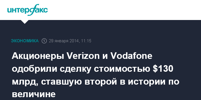 Лондон. 29 января. INTERFAX.RU - Акционеры американской телекоммуникационной компании Verizon Communications и британской Vodafone Group утвердили сделку по продаже Verizon 45% акций их совместного предприятия Verizon Wireless за $130 млрд подавляющим большинством голосов.
