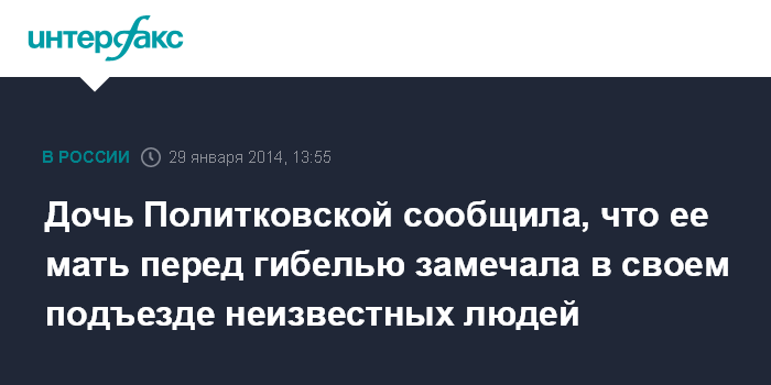 Москва. 29 января. INTERFAX.RU - Журналистка "Новой газеты" Анна Политковская перед гибелью замечала, что в подъезде ее дома бывают незнакомые люди, сообщила в суде ее дочь Вера Политковская.