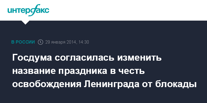 Москва. 29 января. INTERFAX.RU - В парламентском большинстве поддержали просьбу заксобрания Петербурга, которое обратилось в Госдуму с просьбой изменить название памятной даты, отмечаемой 27 января в связи с освобождением Северной столицы от блокады.