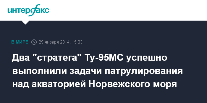 "Маршрут полета проходил через нейтральные воды над акваторией Норвежского моря, Северного Ледовитого океана, вдоль Кольского полуострова", - сообщил "Интерфаксу" в среду официальный представитель ВВС России полковник Игорь Климов.
