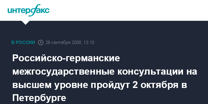 Москва. 26 сентября. INTERFAX.RU – Очередной, десятый раунд российско-германских межгосударственных консультаций на высшем уровне с участием членов правительств пройдет в соответствии с договорённостью президента РФ и канцлера ФРГ 2 октября в Петербурге, сообщает пресс-служба Кремля.