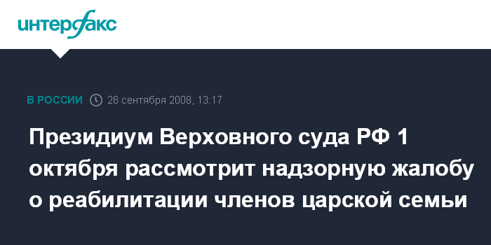 По словам адвоката, надзорную жалобу о реабилитации членов царской семьи рассмотрит президиум Верховного суда РФ. "Судья Верховного суда, изучив надзорную жалобу Великой княгини, нашел ее обоснованной и вынес постановление о возбуждении надзорного производства и передаче жалобы на рассмотрение президиума Верховного суда", - отметил адвокат.