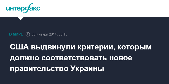 Москва. 30 января. INTERFAX.RU - Представитель госдепартамента США Дженнифер Псаки выдвинула критерии, которым, по мнению Соединенных Штатов, должно соответствовать новое украинское правительство.