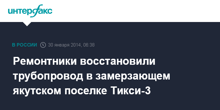 Москва. 30 января. INTERFAX.RU - В Якутии ремонтные бригады завершили работы по восстановлению водовода от водонасосного комплекса к поселку Тикси-3, сообщает в четверг пресс-служба администрации президента и правительства Якутии.