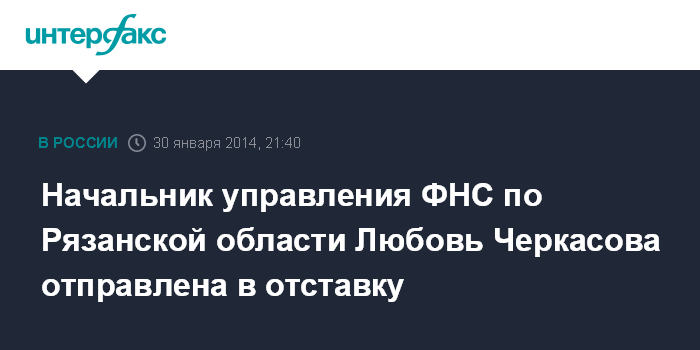 Москва. 30 января. INTERFAX.RU - Руководство Федеральной налоговой службы (ФНС) отправило в отставку начальника управления ФНС по Рязанской области Любовь Черкасову, сообщила официальный представитель ведомства Лариса Катышева.