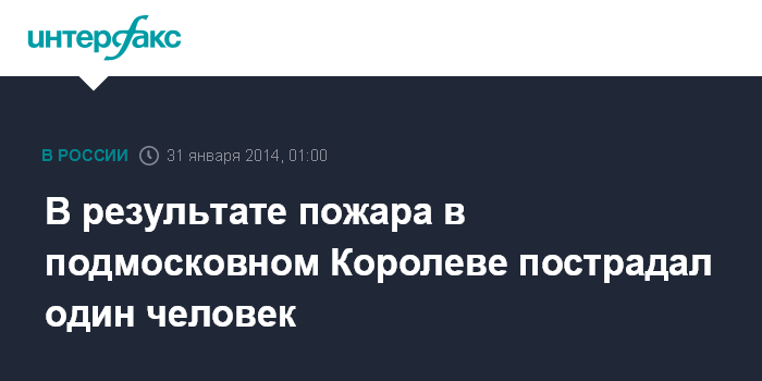 Москва. 31 января. INTERFAX.RU - Один человек пострадал в результате пожара в многоэтажном доме в подмосковном Королеве, сообщили "Интерфаксу" в пятницу в пресс-службе ГУ МВД РФ по Московской области.