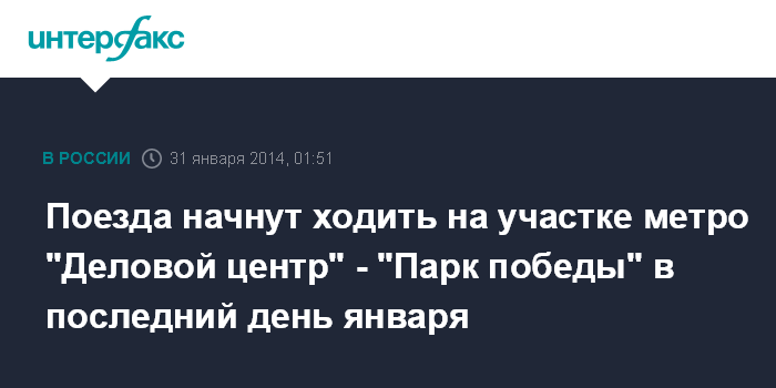 Москва. 31 января. INTERFAX.RU - Движение поездов на участке московского метро "Деловой центр" - "Парк победы" откроется в пятницу, сообщили "Интерфаксу" в пресс-службе столичного департамента строительства.