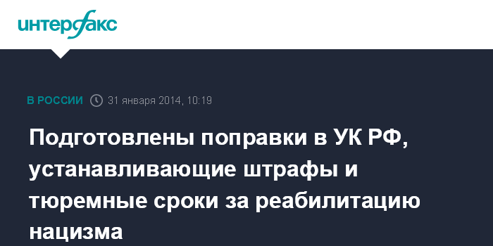 Москва. 31 января. INTERFAX.RU - Депутаты предлагают предусмотреть в Уголовном кодексе РФ норму, устанавливающую ответственность за реабилитацию нацизма.