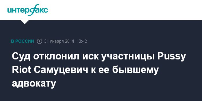 Москва. 31 января. INTERFAX.RU - Гагаринский суд Москвы отказал в удовлетворении иска о защите чести и достоинства одной из участниц панк-группы Pussy Riot Екатерины Самуцевич, которая требовала от своего экс-адвоката Николая Полозова 3 млн рублей компенсации морального вреда.