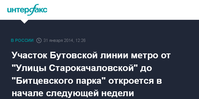 Москва. 31 января. INTERFAX.RU - Новый участок Бутовской линии московского метро, который соединит действующую станцию "Улица Старокачаловская" со станцией "Битцевский парк", будет открыт в начале будущей недели, сообщил "Интерфаксу" источник в транспортном комплексе столицы в пятницу.