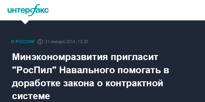 Москва. 31 января. INTERFAX.RU - Министерство экономического развития (Минэкономразвития) РФ намерено пригласить представителей проекта "РосПил" Алексея Навального для участия в экспертном совете при ведомстве, который будет заниматься приемом жалоб и доработкой вступившего в силу с 1 января закона о контрактной системе.