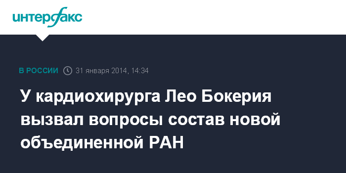 Москва. 31 января. INTERFAX.RU - Глава Научного центра сердечно-сосудистой хирургии им. Бакулева Лео Бокерия не обнаружил в составе новой объединенной Российской академии наук членов-корреспондентов прежней Академии медицинских наук, в том числе своих сотрудников.