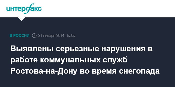 Москва. 31 января. INTERFAX.RU - Проверка деятельности коммунальных служб Ростова-на-Дону во время недавнего снегопада, проводимая органами прокуратуры, уже выявила многочисленные нарушения и недоработки, сообщили агентству "Интерфакс" в пятницу в пресс-службе прокуратуры Ростовской области.