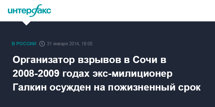 Краснодар. 31 января. INTERFAX.RU - Бывший милиционер Илья Галкин и телеоператор Михаил Денисенко, организовавшие серию взрывов в Сочи в 2008-2009 годах, в пятницу приговорены соответственно к пожизненному сроку и 21,5 годам заключения, передал корреспондент агентства "Интерфакс".