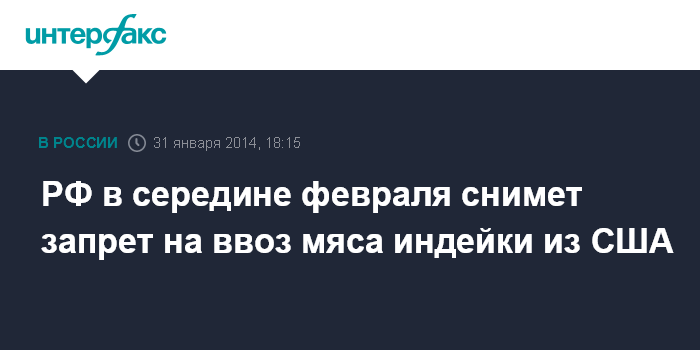 Москва. 31 января. INTERFAX.RU - Россия в середине февраля снимет запрет на ввоз мяса индейки из США, введенный в феврале прошлого года из-за использования при его производстве стимулятора роста рактопамина.