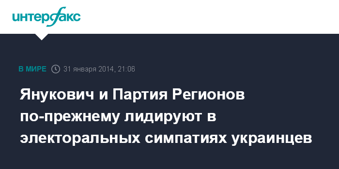 Москва. 31 января. INTERFAX.RU - Если бы выборы президента Украины состоялись в ближайшее воскресенье, кандидатуру действующего президента Украины Виктора Януковича поддержали бы 19,8% человек, свидетельствуют результаты социологического исследования Центра социальных и маркетинговых исследований "Социс", обнародованные в пятницу.