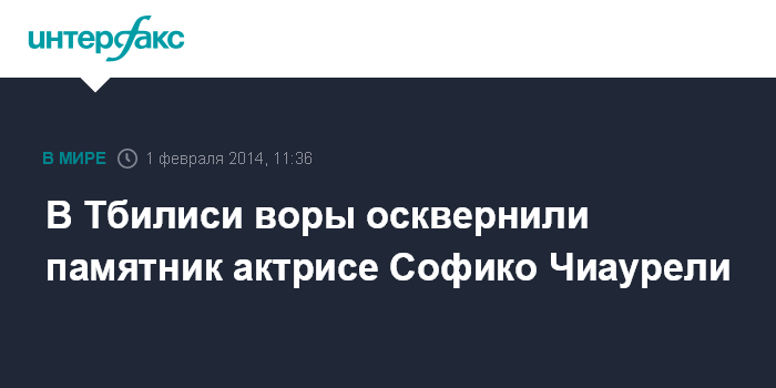 Москва. 1 февраля. INTERFAX.RU - В Тбилиси в сквере Сиони неизвестные разграбили бронзовую скульптурную композицию, посвященную народной артистке Грузии, актрисе Софико Чиаурели. Как сообщают в субботу грузинские СМИ, из композиции украдены две из четырех бронзовых небольших скульптур, изображающих роли в кинофильмах, в которых играла Софико Чиаурели.