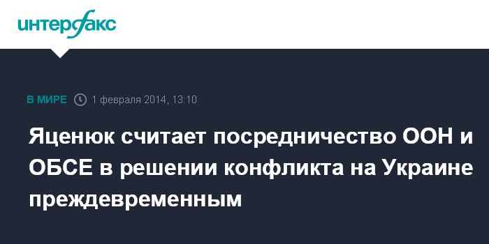 Москва. 1 февраля. INTERFAX.RU - Глава фракции "Батькивщина" Арсений Яценюк считает преждевременным привлекать к решению политического конфликта на Украине помощь такие организации как ООН и ОБСЕ, хотя те и выразили соответствующую готовность. В частности, генеральный секретарь ООН Пан Ги Мун подтвердил такую готовность со стороны своей организации в ходе встречи с представителями украинской оппозиции, которая состоялась в субботу в Мюнхене в рамках международной конференции безопасности.