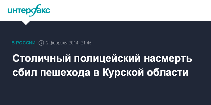 Москва. 2 февраля. INTERFAX.RU - Сотрудник московской полиции, находясь в отпуске, сбил насмерть пешехода, шедшего вдоль дороги в темноте в Курской области, сообщили "Интерфаксу" в пресс-службе ГУ МВД России по Москве.