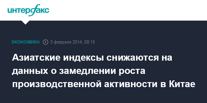 3 февраля. FINMARKET.RU - Фондовые индексы Азиатско-Тихоокеанского региона снижаются в первую февральскую сессию, продолжая январское падение, которое оказалось самым значительным с мая 2013 года. Данные о замедлении роста производственной активности в Китае усилили опасения общего торможения мировой экономики, сообщает агентство Bloomberg.