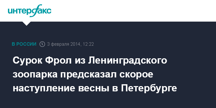 Москва. 3 февраля. INTERFAX.RU - Ручной сурок Фрол из Ленинградского зоопарка предсказал в воскресенье, в День сурка, скорое наступление весны в Петербурге, сообщили "Интерфаксу" в пресс-службе зверинца в понедельник.