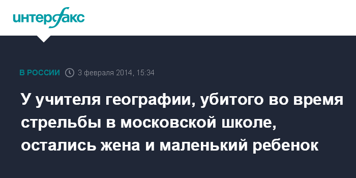Он отметил, что и застреленный им учитель географии также не был замечен в каких-либо конфликтах, обладал уравновешенным характером и ни с кем в школе не конфликтовал, в этой же школе учителем начальных классов работает его жена, погибшему было 28 лет.