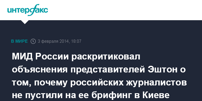 Москва. 3 февраля. INTERFAX.RU - Объяснения пресс-службы высокого представителя ЕС по иностранным делам и политике безопасности Кэтрин Эштон о причинах, по которым российских журналистов не пустили на ее брифинг в Киеве 29 января, в МИД РФ считают неудовлетворительными.