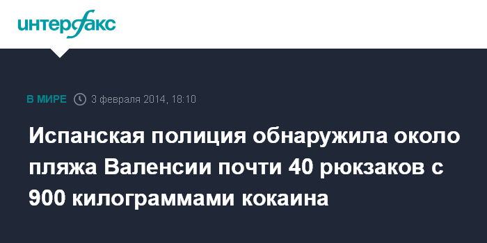Мадрид. 3 февраля. INTERFAX.RU - Полиция Испании в понедельник обнаружила 37 рюкзаков с 900 килограммами кокаина близ одного из пляжей города Валенсия на западе страны.