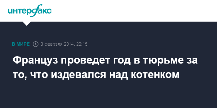 Париж. 3 февраля. INTERFAX.RU - Суд во Франции приговорил к году тюрьмы молодого человека, признанного виновным в издевательстве над котенком по кличке Оскар.