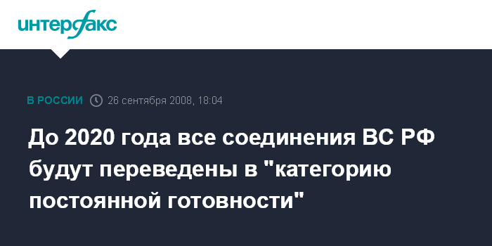 Оренбург. 26 сентября. INTERFAX.RU - Параметры боевого состава Вооруженных сил РФ, утвержденные президентом Дмитрием Медведевым, предусматривают перевод до 2020 г. всех боевых соединений в категорию постоянной готовности.
