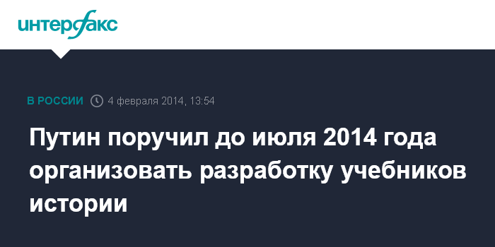 Москва. 4 февраля. INTERFAX.RU - Президент РФ Владимир Путин поручил до июля Минобрнауки совместно с Российским историческим обществом организовать разработку линейки учебников и пособий по отечественной истории на основе новой концепции.