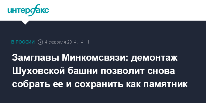 "Демонтаж Шуховской башни является необходимым условием сохранения этого уникального исторического и культурного наследия. Оптимальное время проведения работ по демонтажу - весна - лето", - заявил Волин "Интерфаксу" во вторник.