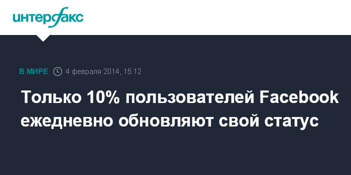 Москва. 4 февраля. INTERFAX.RU - Из 1,2 млрд пользователей Facebook только 10% ежедневно обновляют статус, 4% делают это чаще одного раза в день, свидетельствуют данные опроса Pew Research, проведенного к десятилетию социальной сети.