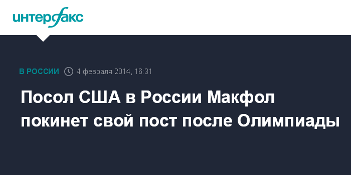 Москва. 4 февраля. INTERFAX.RU - Посол США в Москве Майкл Макфол сообщил, что покидает свой пост после завершения Олимпийских игр в Сочи.