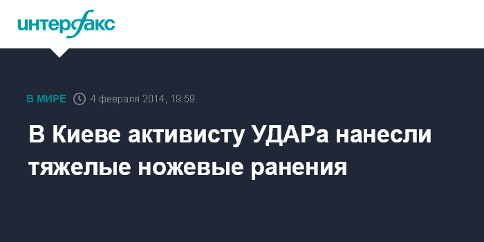 Киев. 4 февраля. INTERFAX.RU - На активиста Киевской организации партии УДАР напали неизвестные и нанесли ножевые ранения.
