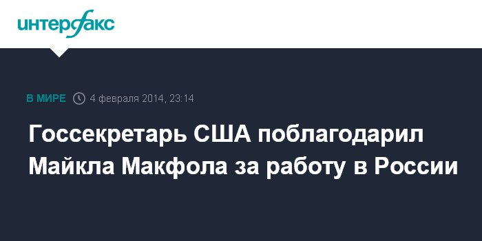 "Позвольте мне воспользоваться возможностью и сказать, что конечно, госсекретарь невероятно признателен (Макфолу - ИФ) за его службу", - сказала Псаки. "Он (Макфол - ИФ) был бесценным государственным служащим и дипломатом, и госсекретарь Керри желает ему всего хорошего в будущем", - добавила она.