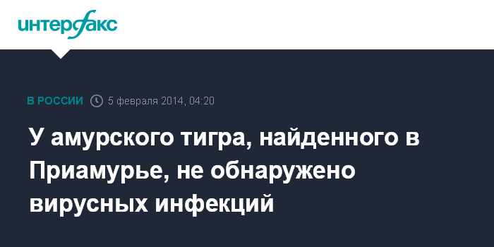Москва. 5 февраля. INTERFAX.RU - Анализы, взятые у спасенного в тайге Приамурья тигра, не показали наличия у животного инфекционных заболеваний, сообщает сайт Минприроды РФ в среду.