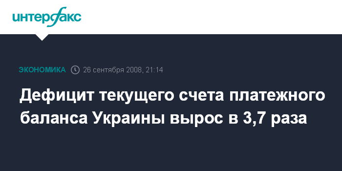 Москва. 26 сентября. INTERFAX.RU - Дефицит текущего счета платежного баланса Украины в январе-августе 2008 года возрос в 3,7 раза по сравнению с аналогичным периодом 2007 года - до $7,5 млрд, или 6% ВВП, такие предварительные данные сообщил Нацбанк Украины (НБУ) в пятницу.