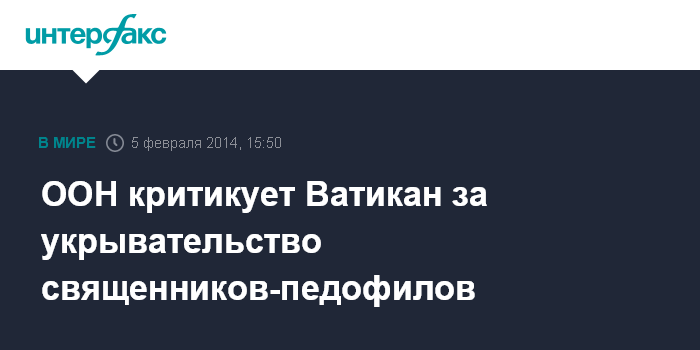 Москва. 5 февраля. INTERFAX.RU - ООН обвинила Ватикан в систематическом проведении политики, поощряющей сокрытие фактов домогательства священников к детям, говорится в заявлении Комитета ООН по правам ребенка, опубликованном в среду.