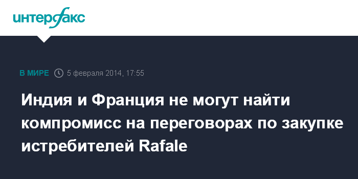 Москва. 5 февраля. INTERFAX.RU - Переговоры по многомиллиардной сделке на покупку Индией 126 истребителей Rafale в Индию зашли в тупик, сообщает американский оборонный Интернет-портал Defensenews со ссылкой на источники в индийском военном ведомстве.