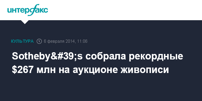Лондон. 6 февраля. INTERFAX.RU - Аукционный дом Sotheby's выручил рекордные 163,5 млн фунтов стерлингов ($266,8 млн) на аукционе произведений импрессионизма, модернизма и сюрреализма в Лондоне 5 февраля, который посетили коллекционеры из 44 стран, сообщило агентство Bloomberg.