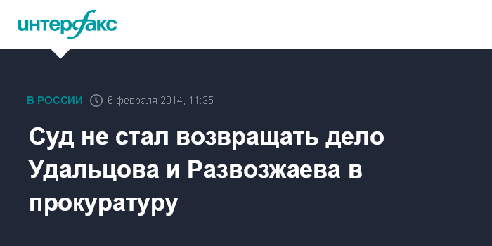Москва. 6 февраля. INTERFAX.RU - Москва. 6 февраля. ИНТЕРФАКС - Мосгорсуд принял решение не отправлять повторно в прокуратуру материалы уголовного дела в отношении оппозиционеров Сергея Удальцова и Леонида Развозжаева, обвиняемых в организации массовых беспорядков.