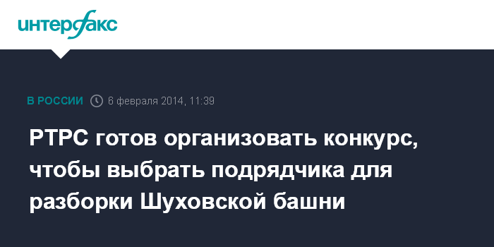Москва. 6 февраля. INTERFAX.RU - Москва. 6 февраля. ИНТЕРФАКС - ФГУП "Российская телевизионная и радиовещательная сеть" заявляет о готовности организовать конкурс для определения исполнителя работ по реконструкции в Москве разрушающейся радиобашни Шухова и участвовать в их финансировании.