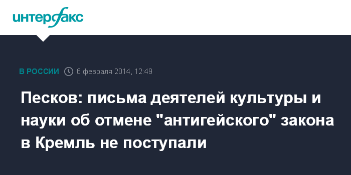 Москва. 6 февраля. INTERFAX.RU - В Кремле пока не получали обращений 200 деятелей культуры и 27 Нобелевских лауреатов, призывающих отменить закон, запрещающий пропаганду нетрадиционных сексуальных отношений среди несовершеннолетних, сообщил пресс-секретарь президента РФ Дмитрий Песков.