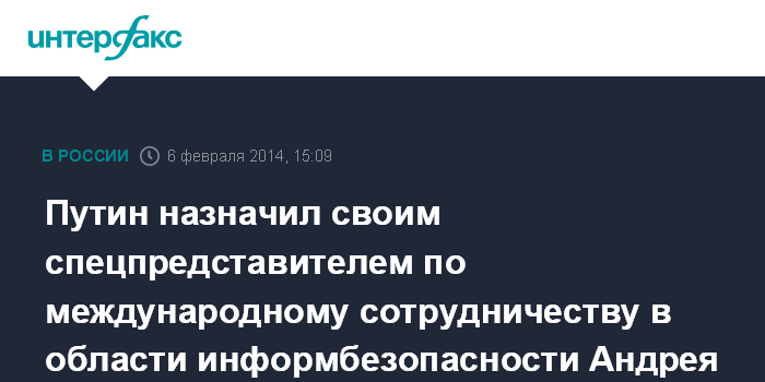 Москва. 6 февраля. INTERFAX.RU - Президент России Владимир Путин назначил своим спецпредставителем по вопросу международного сотрудничества в области информационной безопасности Андрея Крутских.