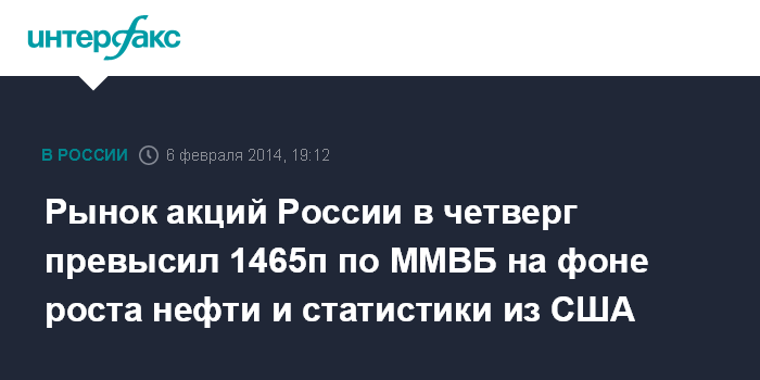 Москва. 6 февраля. INTERFAX.RU - Российский рынок акций в четверг поднялся выше 1465 пунктов по индексу ММВБ вслед за подорожавшей нефтью на фоне ослабления доллара к евро после выступления главы ЕЦБ Марио Драги, разочаровавшего инвесторов; статистика из США поддержала оптимизм игроков.