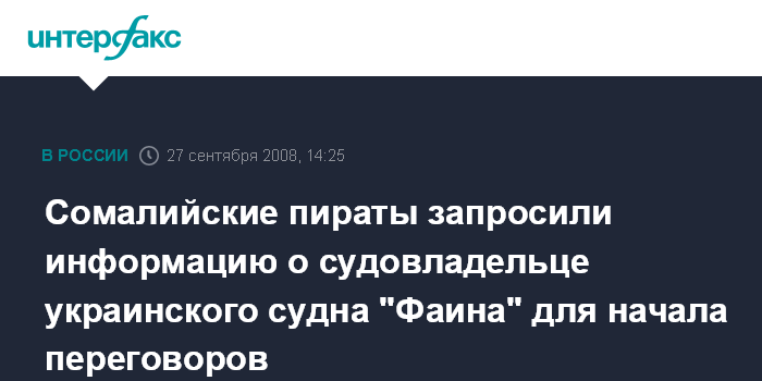 Москва. 27 сентября. INTERFAX.RU - Пираты, захватившие у берегов Сомали украинское судно "Фаина", перевозившее танки Т-72, вышли на связь с Министерством обороны Кении, запросив данные о судовладельце для начала переговоров, сообщил агентству "Интерфакс-Украина" информированный источник в субботу.