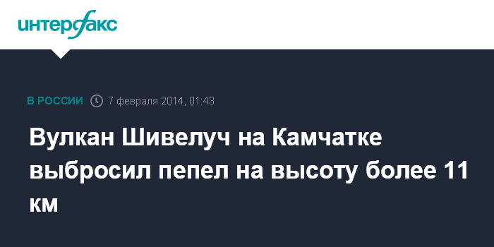 Москва. 7 февраля. INTERFAX.RU - Вулкан Шивелуч, извергающийся на Камчатке, выбросил столб пепла на высоту 11 км 200 м над уровнем моря, сообщили агентству "Интерфакс-Дальний Восток" в ГУ МЧС по Камчатскому краю в пятницу.