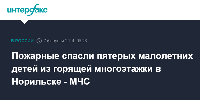 Москва. 7 февраля. INTERFAX.RU - Трое годовалых малышей и двое пятилетних детей были спасены пожарными из горящего дома в Норильске, сообщает пресс-служба ГУ МЧС России по Красноярскому краю.