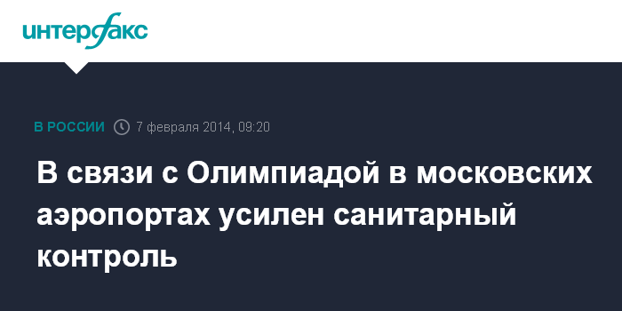 Москва. 7 февраля. INTERFAX.RU - В аэропортах столичного авиаузла - "Шереметьево" и "Внуково" - вплоть до 21 марта усилен санитарно-карантинный контроль за гражданами, прибывающими в Россию транзитом и следующими на Олимпийские зимние игры в Сочи.